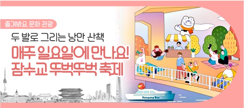 10월 매주 연휴에는 여기~!! 잠수교 뚜벅뚜벅 축제.. 온가족이 함께해요!!가을이 성큼 다가온 한강, 서울의 대표적인 행사로 자리잡은 ‘잠수교 뚜벅뚜벅 축제’가 다시 한 번 특별한 추억을 선사
