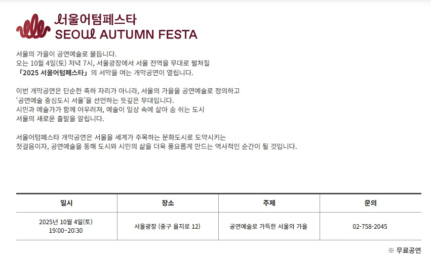 [서울소식] 이번 주말 여기? 2025 서울어텀페스타, 서울의 대표 공연문화축제 총정리 (무료공연,