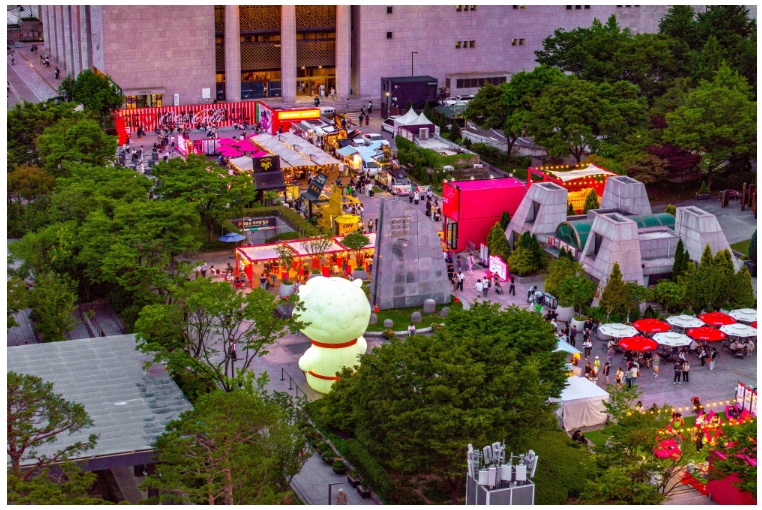- 피크닉·쉼터존: 푸드마켓 한복판 잔디 광장에 빈백 체어, 테이블 등이 마련되어 쾌적하게 휴식하며 배경음악까지 만끽할 수 있습니다.