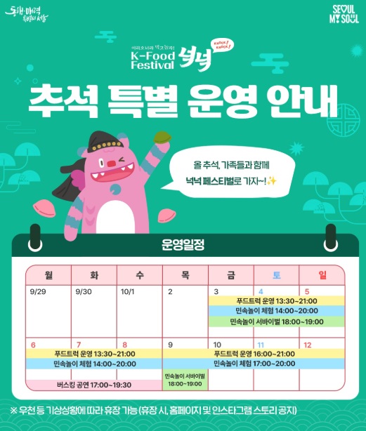 추석 연휴 서울 도심에서 한식과 전통놀이, 페스티벌의 즐거움을 모두 누리고 싶다면 K-푸드 페스티벌 넉넉을 추천드려요. 가족, 친구, 연인 누구와도 좋은 추억을 만들 수 있고, 외국인에게 서울 추석의 매력을 소개하기에도 손색없는 축제입니다. 주차가 혼잡하니 대중교통 이용, 편의시설 미리 체크, 인기 타임(오후~저녁)에 미리 방문을 추천드립니다.